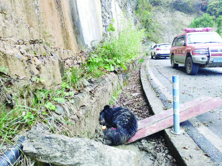 受伤黑熊躺在路边等待专业人员救援