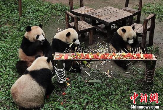 6月1日,重庆动物园的大熊猫享用“自助烧烤”过“六一”国际儿童节。当日,重庆动物园的工作人员们将玉米、圣女果、西瓜、南瓜、香蕉、菠萝、苹果、黄瓜、胡萝卜、笋子等12种蔬菜和水果制作成串串,送给大熊猫作为节日礼物。