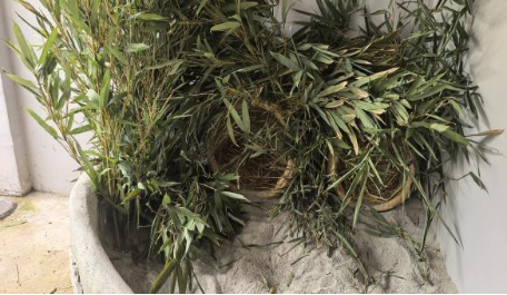 丰容工作秉持生态环保、因地制宜原则,充分利用熊猫馆使用后的废弃竹枝,搭配成品草窝、稻草、枯枝及橡皮桶等材料,依据不同雉类特性,定制搭建大小适配的生态巢穴。在外区沙地(非防雨区域),采用半埋式橡皮桶内置枯树叶,外层以竹枝、竹叶严密遮掩,打造兼具避雨与隐蔽性的巢穴;在内区(防风雨区域),以成品草窝为基底,用竹枝竹叶遮挡隐蔽,窝内铺设稻草、放置假蛋,模拟温暖安全的繁育环境;针对体型较大的绿孔雀,依托圈舍内树木支撑,用竹枝搭建2个带隐蔽通道的大型专属巢穴。